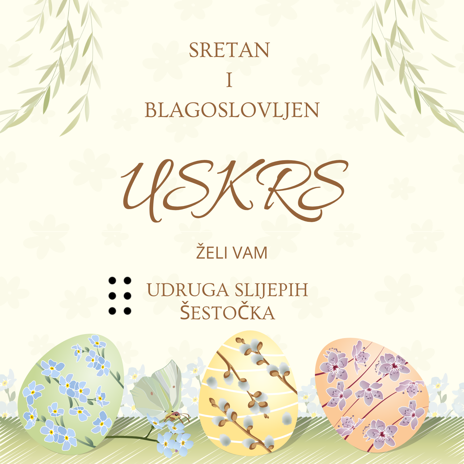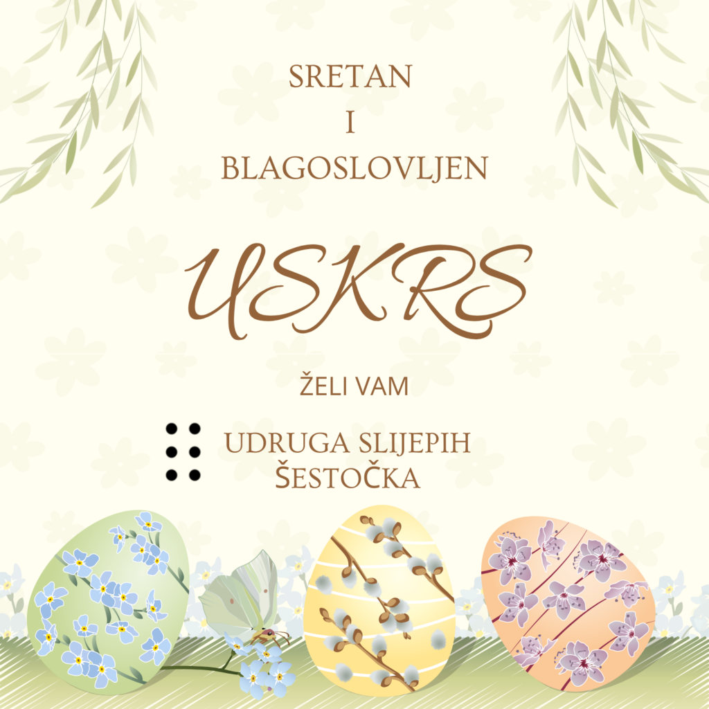 Sretan Uskrs ispunjen lijepim trenutcima uz obilje sreće, zdravlja i blagostanja da ga provedete u krugu svojih najbližih žele Vam članovi Udruga slijepih Šestočka.